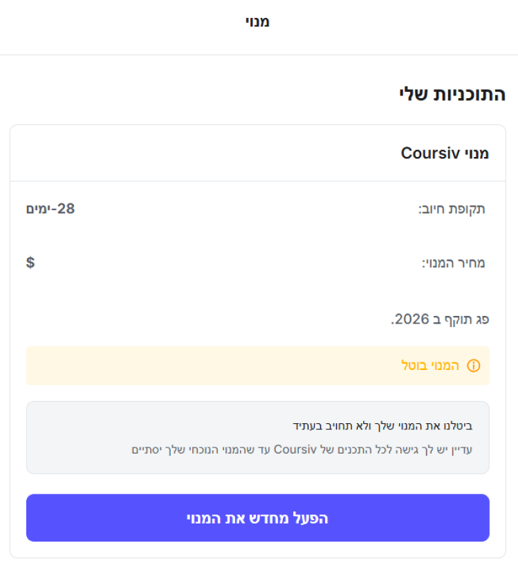 אם ברצונכם לבטל את המנוי ל-Coursiv, אנא עיינו בהוראות להלן: