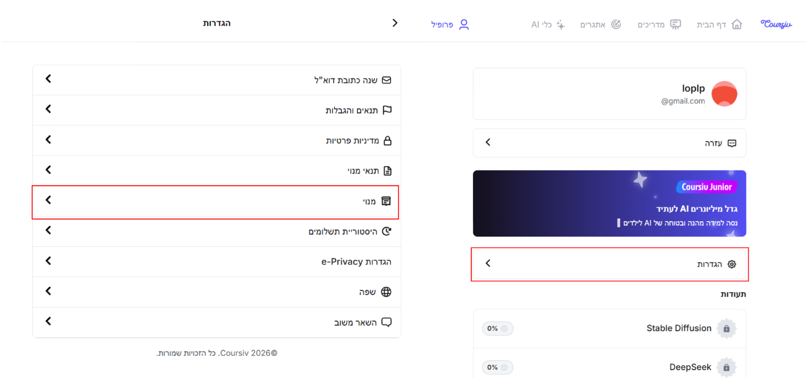 - עברו אל פרופיל Coursiv ולחצו על סמל ההגדרות.
