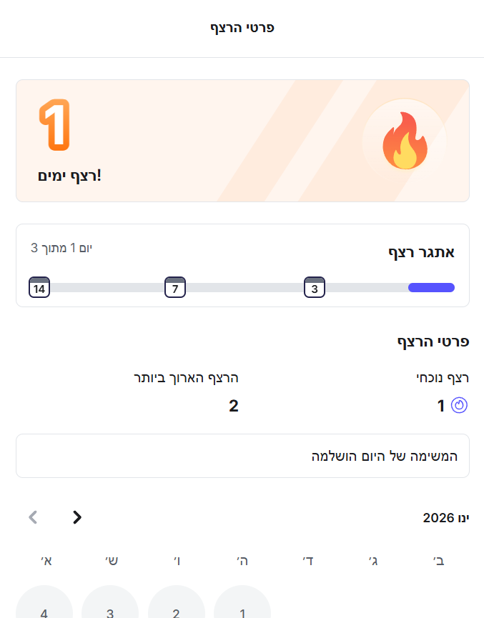 הרצף הוא מערכת תגמול קטנה שמראה כמה אתם עקביים, ועוזרת לכם להישאר במסלול ולהתקדם בהתמדה.